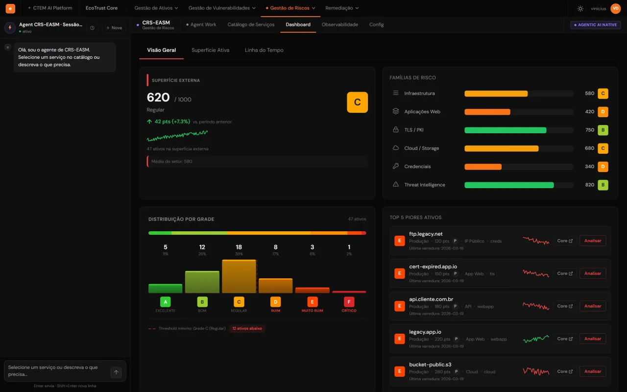 A EcoTrust descobre o que está exposto, calcula quanto isso custa em Reais e corrige automaticamente, enquanto seu time mantém o controle das decisões que importam.